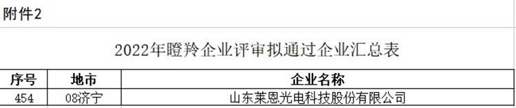 According to the "Management Measures for the Identification of Gazelle and Unicorn Enterprises in Shandong Province" (Lu Gong Xin Fa [2020] No. 8) and the "Notice on Conducting the Cultivation and Identification of Shandong Province's" Specialized, Refined, and New "Small and Medium Enterprises and" Gazelle "and" Unicorn "Enterprises in 2022", the Provincial Department of Industry and Information Technology organized the cultivation and identification of Shandong Province's Gazelle and Unicorn Enterprises in 2022. After voluntary application by enterprises, recommendation by the competent departments of small and medium-sized enterprises in various cities, expert evaluation, third-party credit rating, due diligence of unicorn enterprises, joint final review, and other procedures, Shandong Lai'en Optoelectronics Technology Co., Ltd. is proposed to be a provincial gazelle enterprise in 2022.