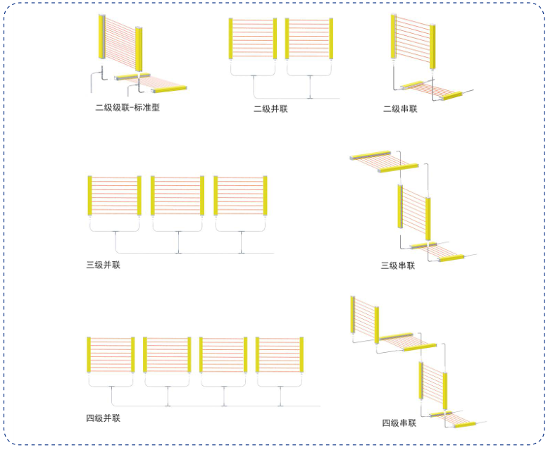 ◆可提供2、3級或4級聯光幕,多種接線方式;