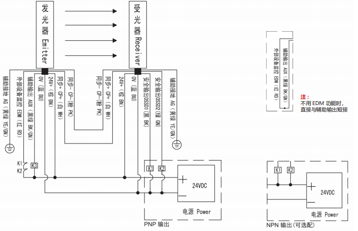 注:E/G系列尺寸及型號同D系列;標準版SND/E/G安全光幕選型表。對于光軸間距為20mm的多功能版SND/E安全光幕,其光束從8路開始,并以4路遞增,如08,12,16, 20,24.......100;對于其他光軸間距的多功能版SND/E安全光幕,可參照選型表。